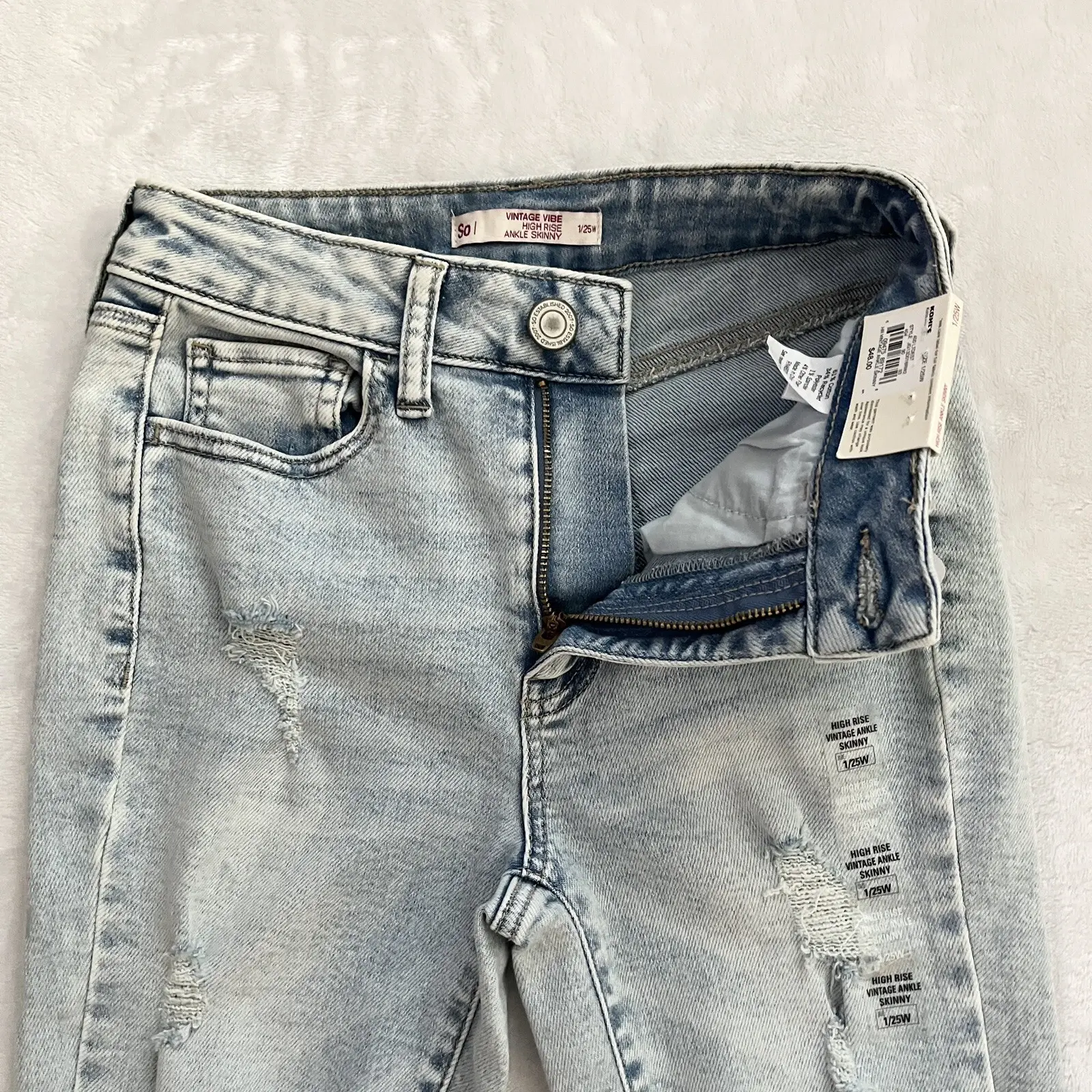 • Features: 100% cotton denim, high-waisted, straight leg, distressed wash, button fly.